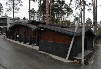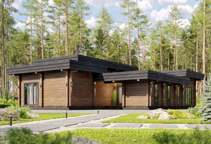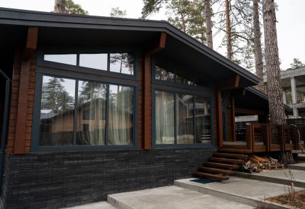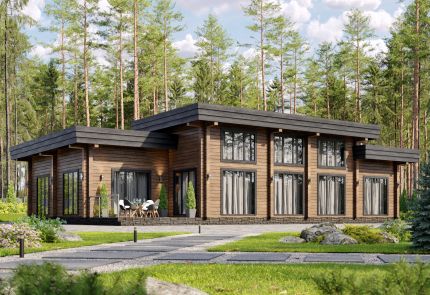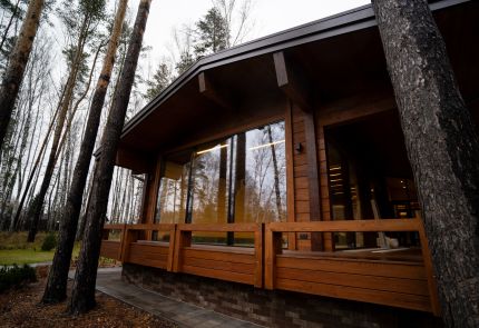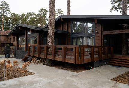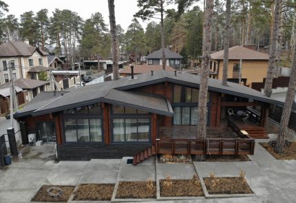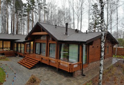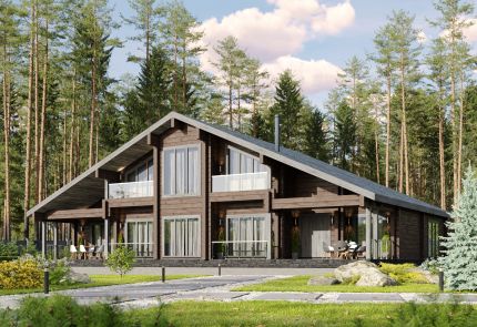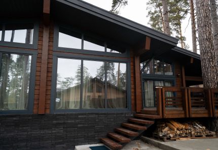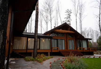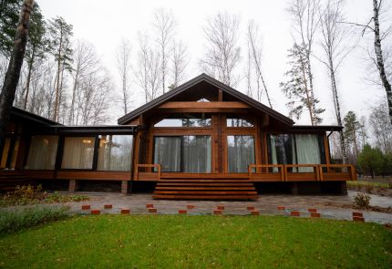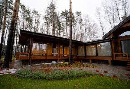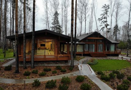 Дом из клееного бруса, площадью которого составляет 478 м2 находится в тихом коттеджном поселке в лесу.