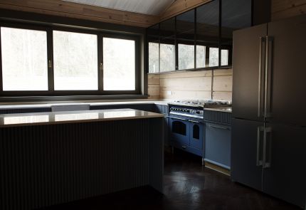 Строительство дома выполнено компанией Кадрин. Завершен тепловой контур с деревянными окнами собственного производства, ведутся отделочные работы.
