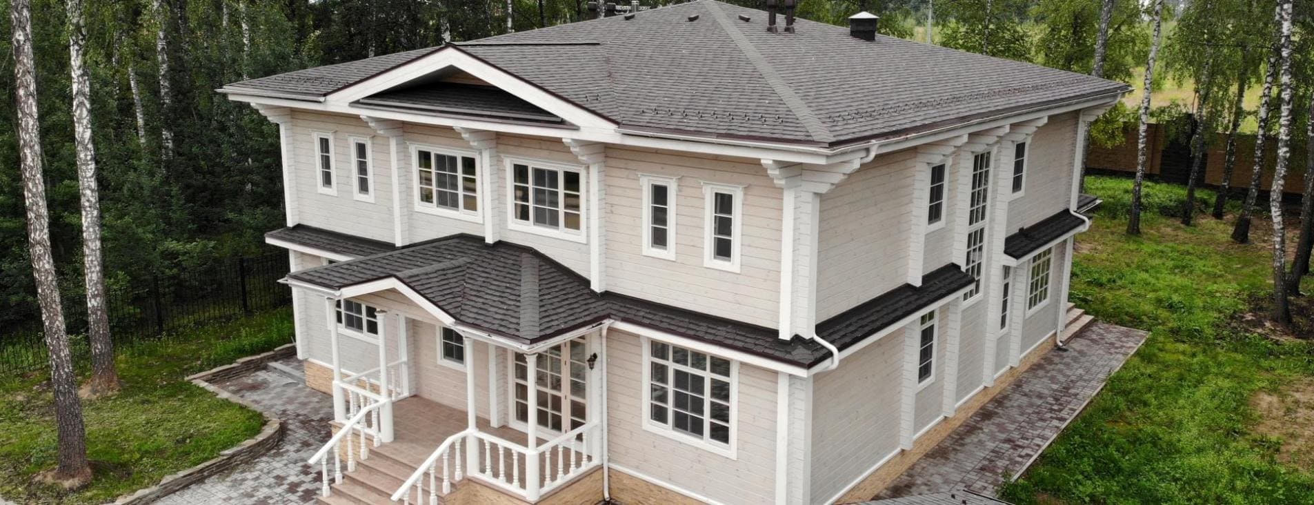 Белоснежный красавец - двухэтажный дом из клееного бруса, построенный по индивидуальному проекту с учетом современных тенденций в домостроении.