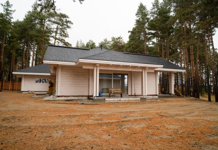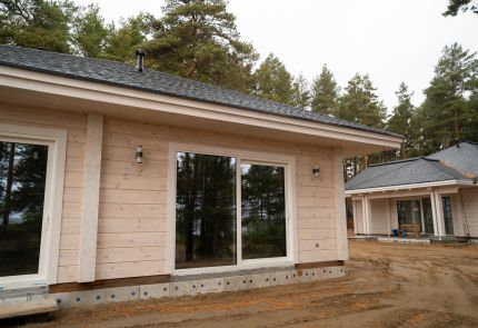 Строительство дома выполнено компанией Кадрин. Завершен тепловой контур с деревянными окнами собственного производства, ведутся отделочные работы.