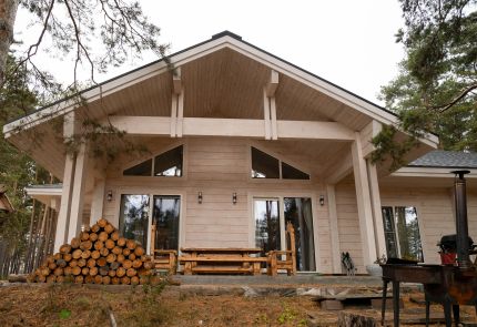 Дом из клееного бруса, площадью которого составляет 478 м2 находится в тихом коттеджном поселке в лесу.
