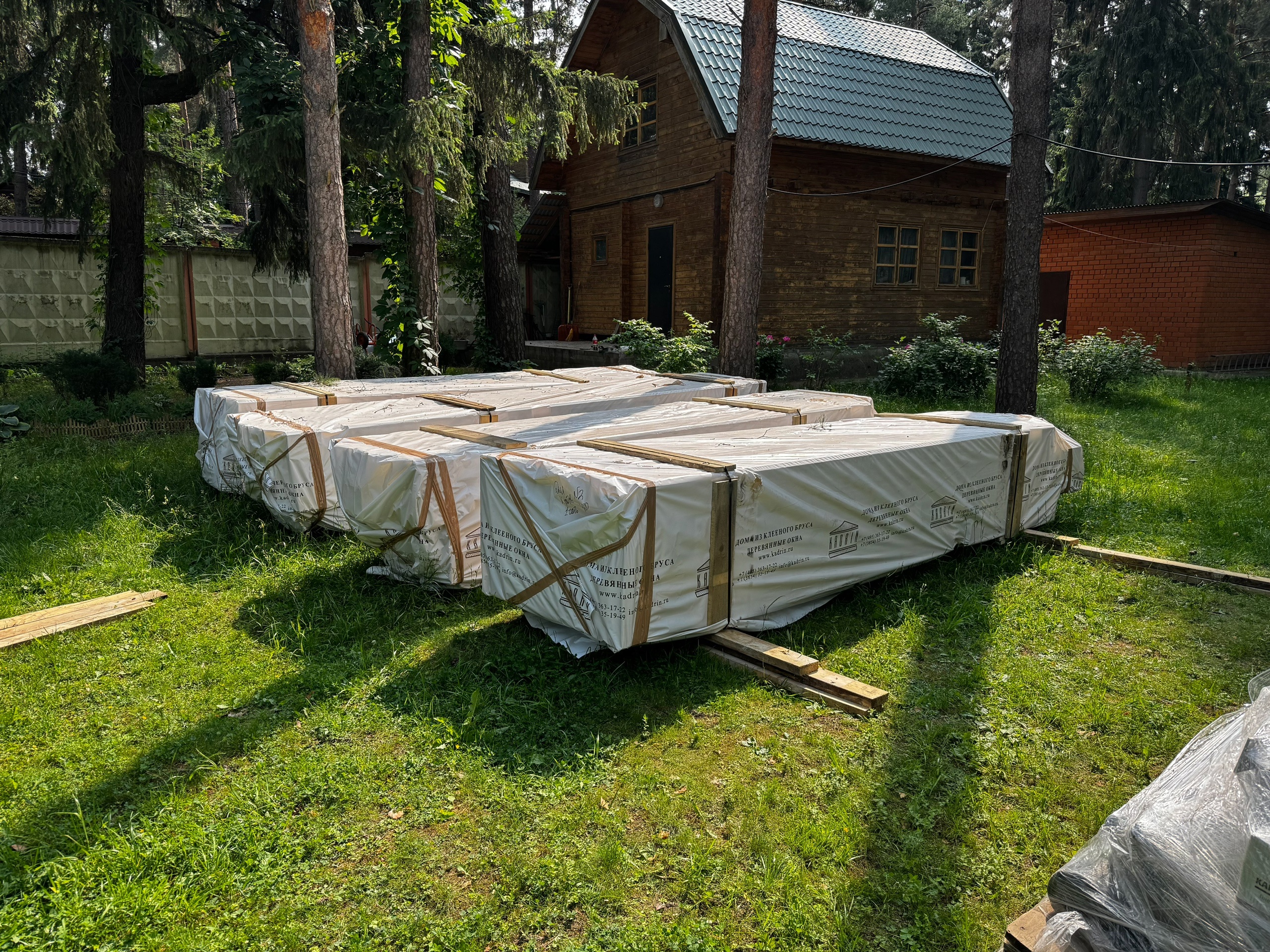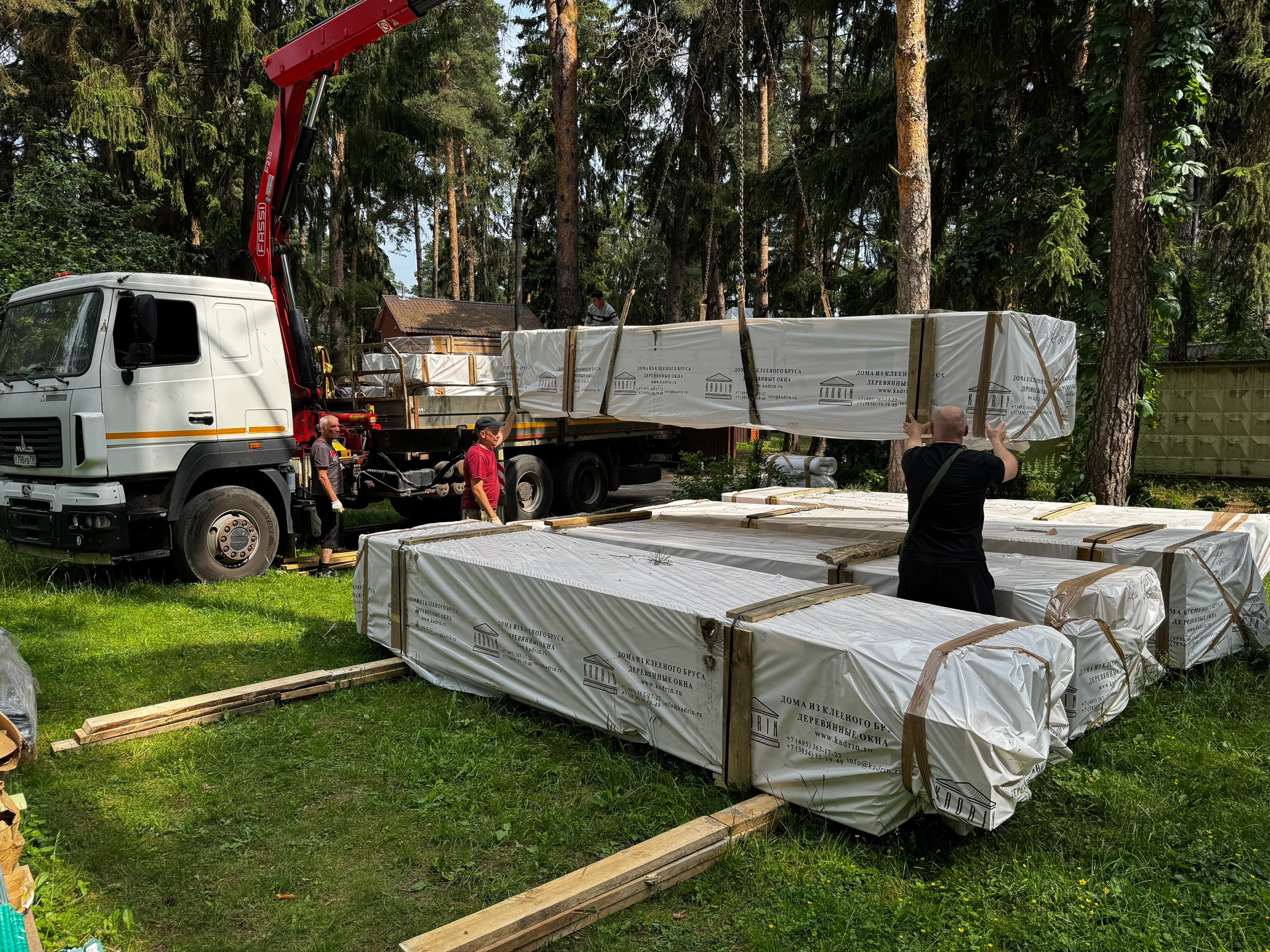 Наши бригада выполнила разгрузку первой партии домокомплекта для сборки сруба дома. Это полностью индивидуальный проект нашего заказчика. Общая площадь дома составляет 186,85 квадратных метров. В строительстве мы будем использовать клееный брус собственного производства из сосны сечением 205х185 мм.