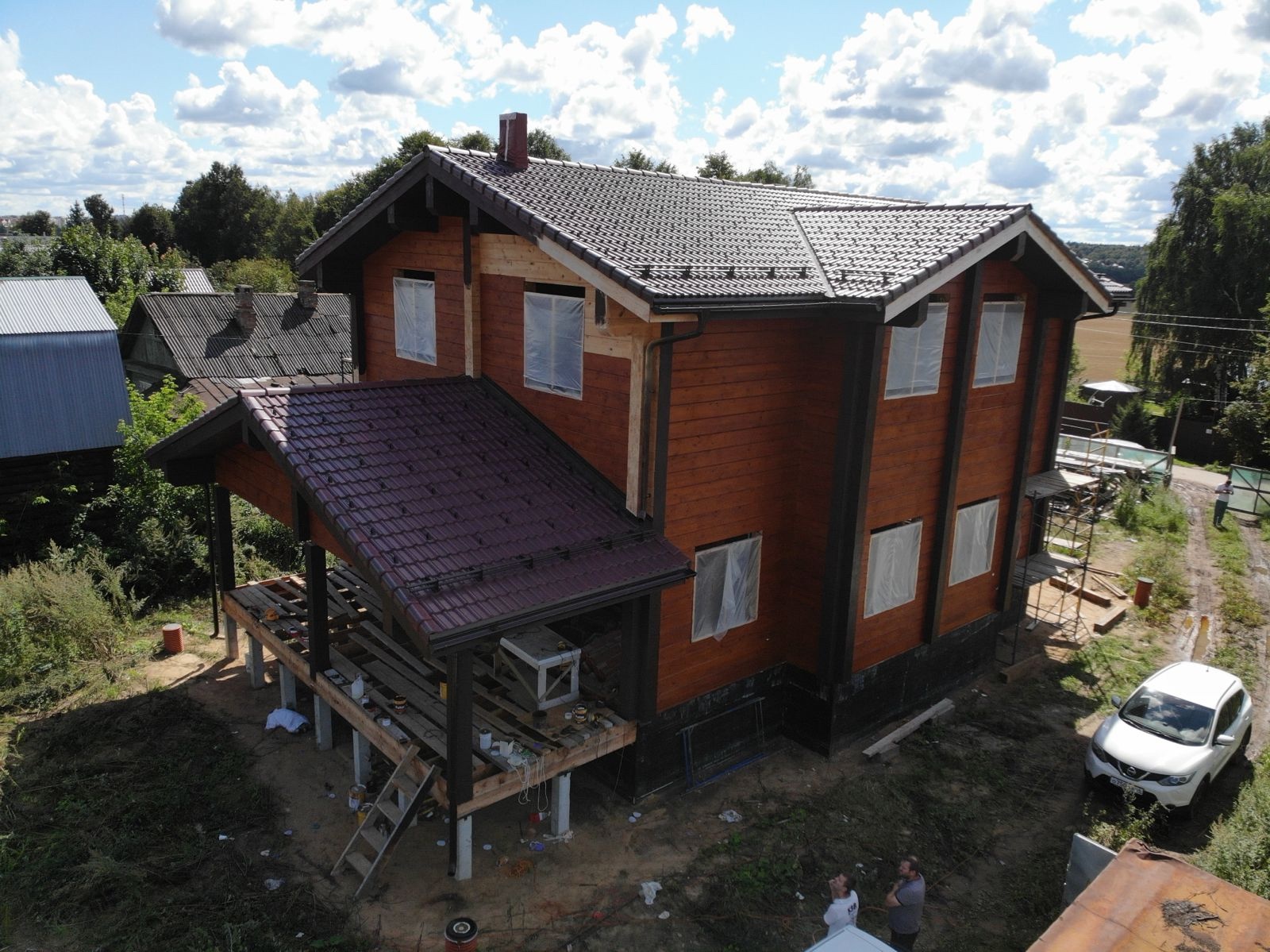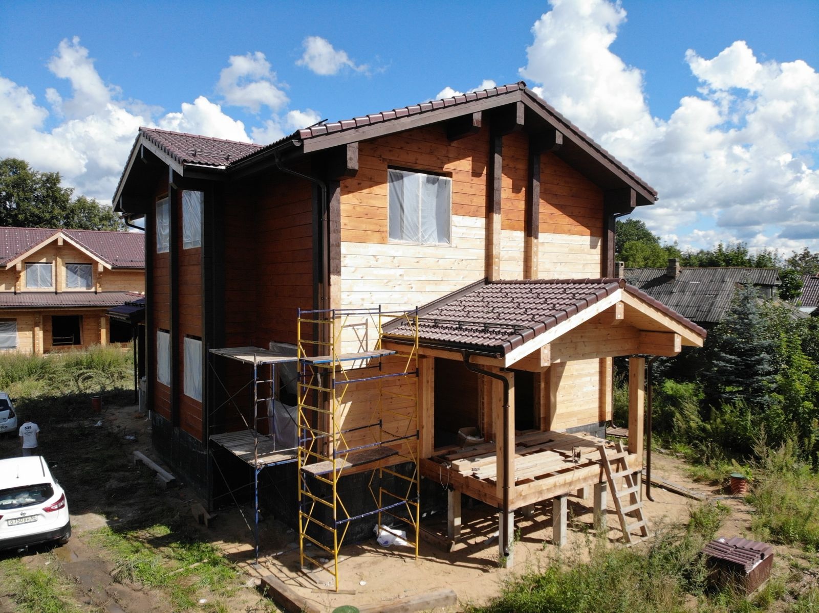 Наша бригада приступила к внешнему окрашиванию. Дом построен из клееного бруса собственного производства из кедра сечением 245х270 мм. Это индивидуальный проект нашего заказчика. Общая площадь дома составляет 256,38 квадратных метров.