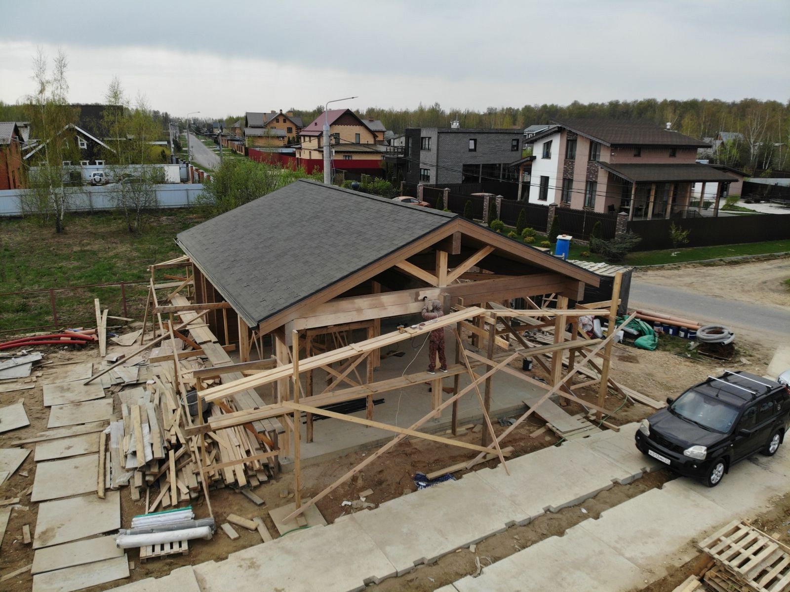 Сейчас наша бригада завершила монтаж финишного покрытия кровли. Также приступили к внешнему окрашиванию. В строительстве мы использовали клееный брус собственного производства из сосны сечением 205х270 мм. Площадь дома составляет 424,61 м2 и площадь технического помещения с навесом 71,9 м2.