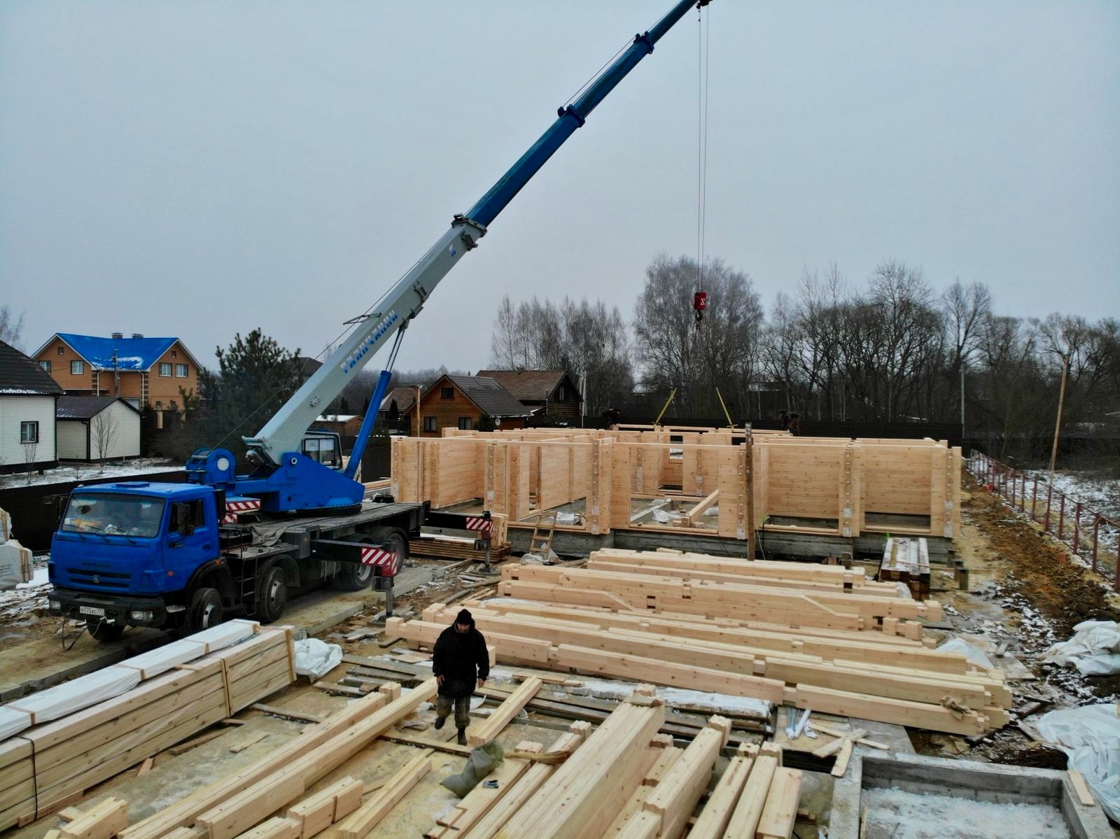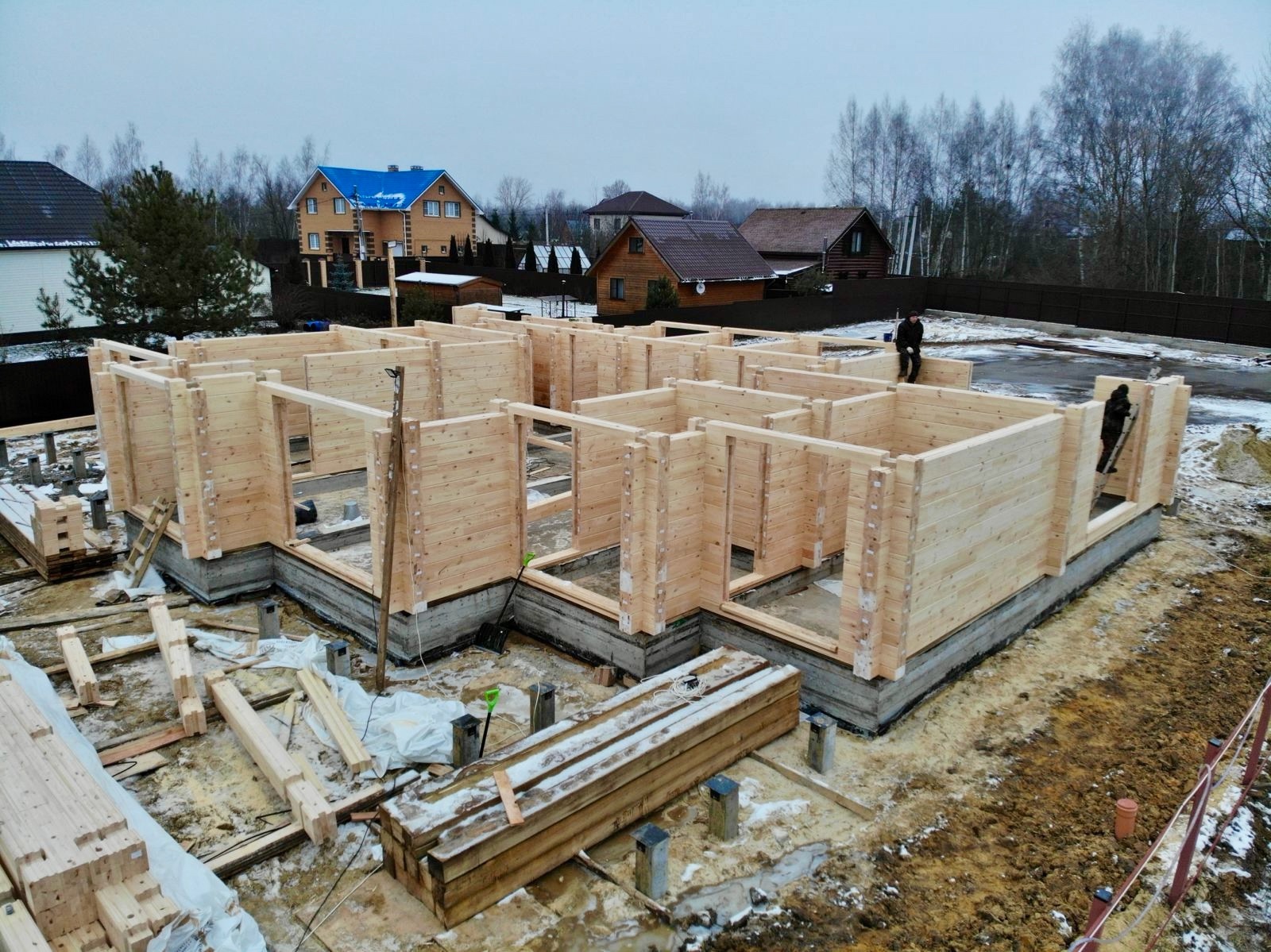 Наша бригада ведет работы по сборке сруба дома. В строительстве мы используем клееный брус собственного производства из сосны сечением 205х270(h) мм. За основу проекта был взят наш типовой проект Турин, но заказчик внес свои индивидуальные изменения. Общая площадь дома составляет 424,61 м2.