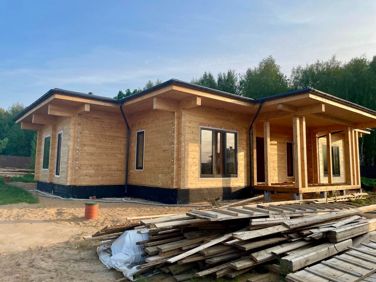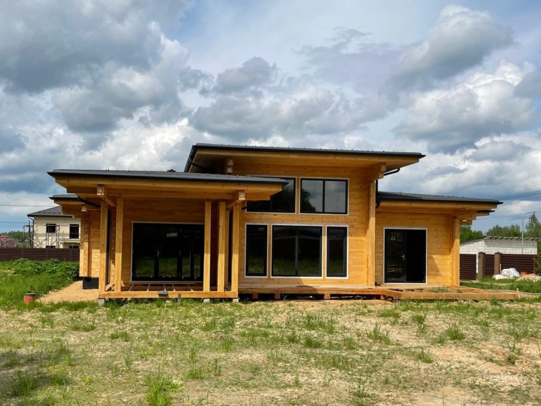 Установили наши деревянные окна из сосны. Общая площадь дома 290,23 м2, индивидуальный проект нашего заказчика, клееный брус из сосны сечением 205х270 мм.