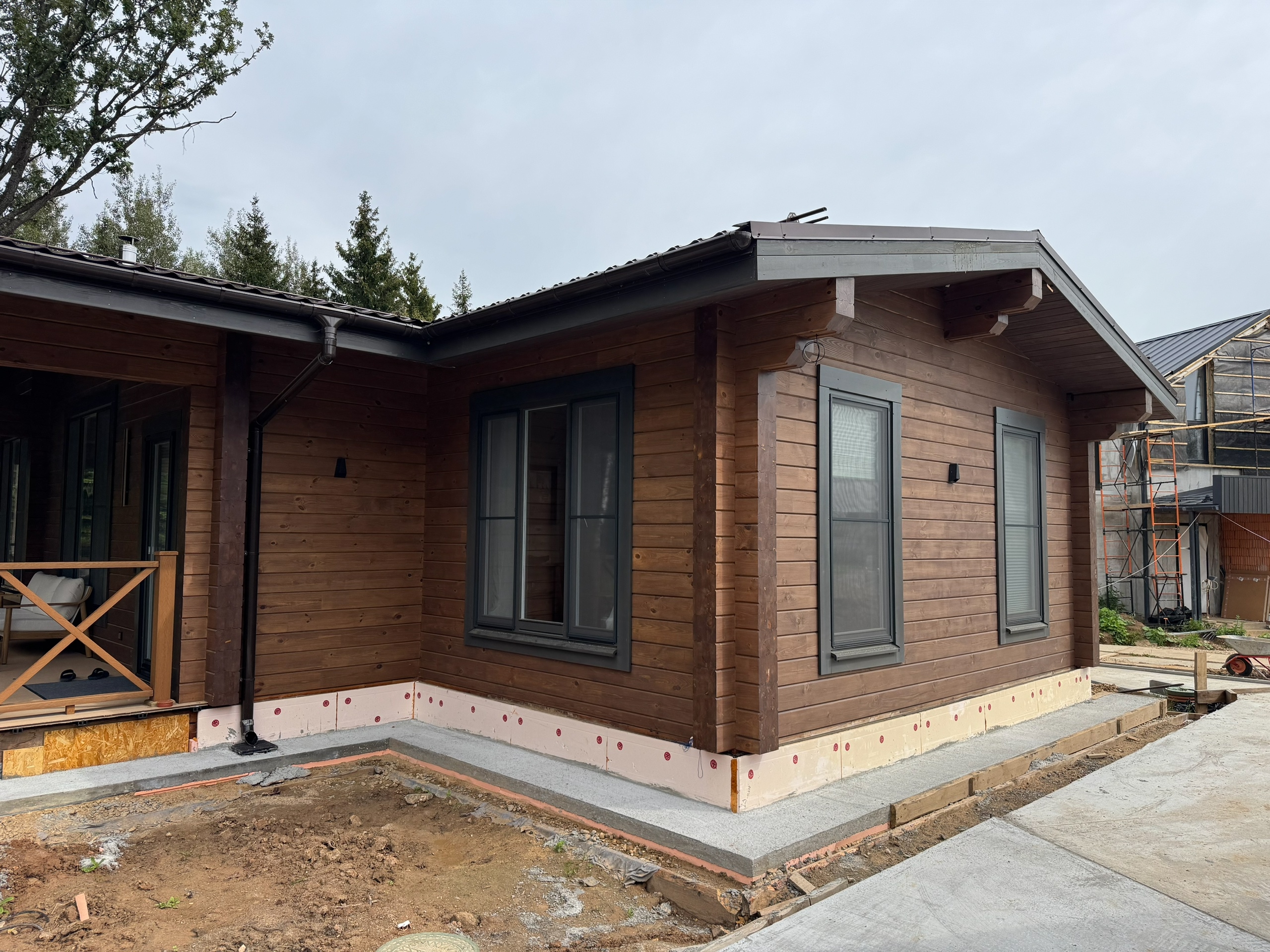 Выполнили заливку отмостки и дорожек. Дом построен по нашему типовому проекту Анси с индивидуальными изменениями планировки.