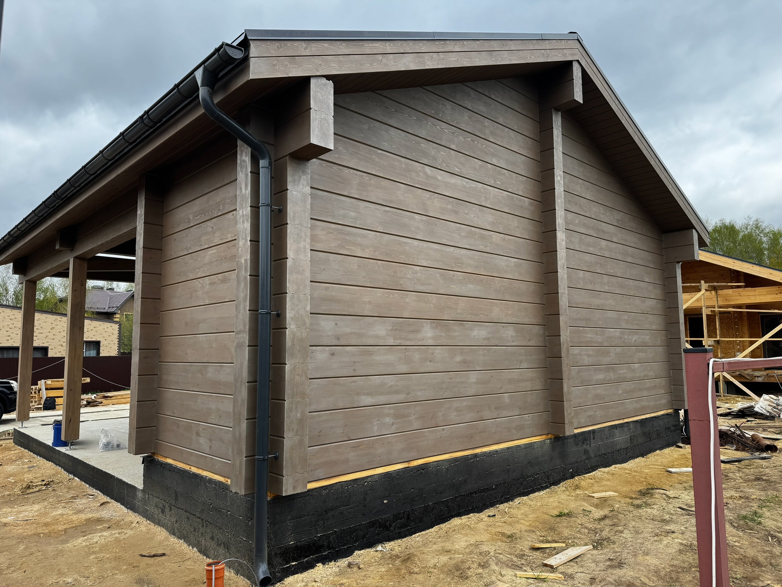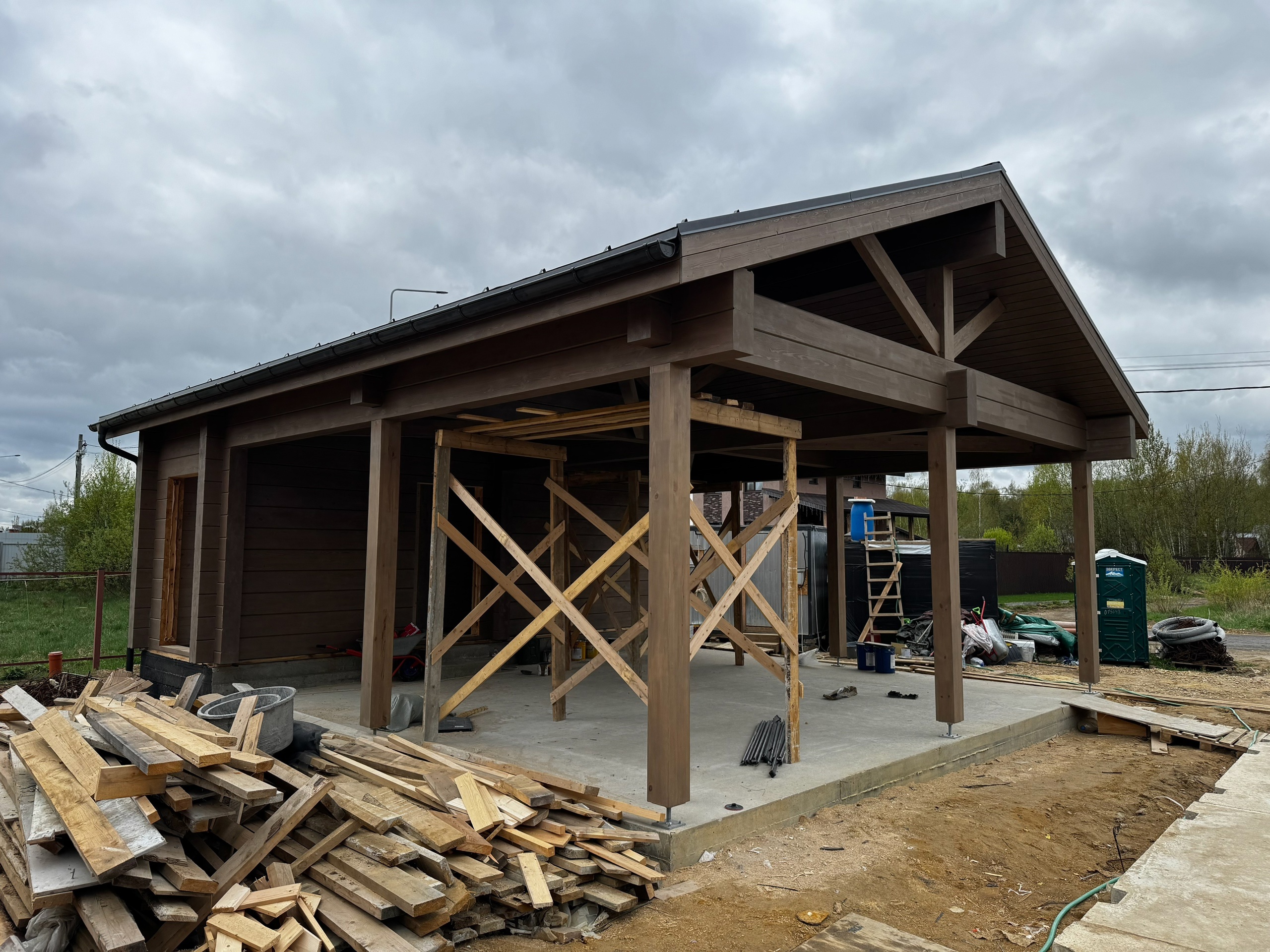 Наша бригада завершила окрашивание технического помещения с навесом в Московской области. Сейчас мы приступили к подготовке и внутреннему окрашиванию дома. В строительстве мы использовали клееный брус собственного производства из сосны сечением 205х270 мм. Площадь технического помещения с навесом составляет 71,9 м2.