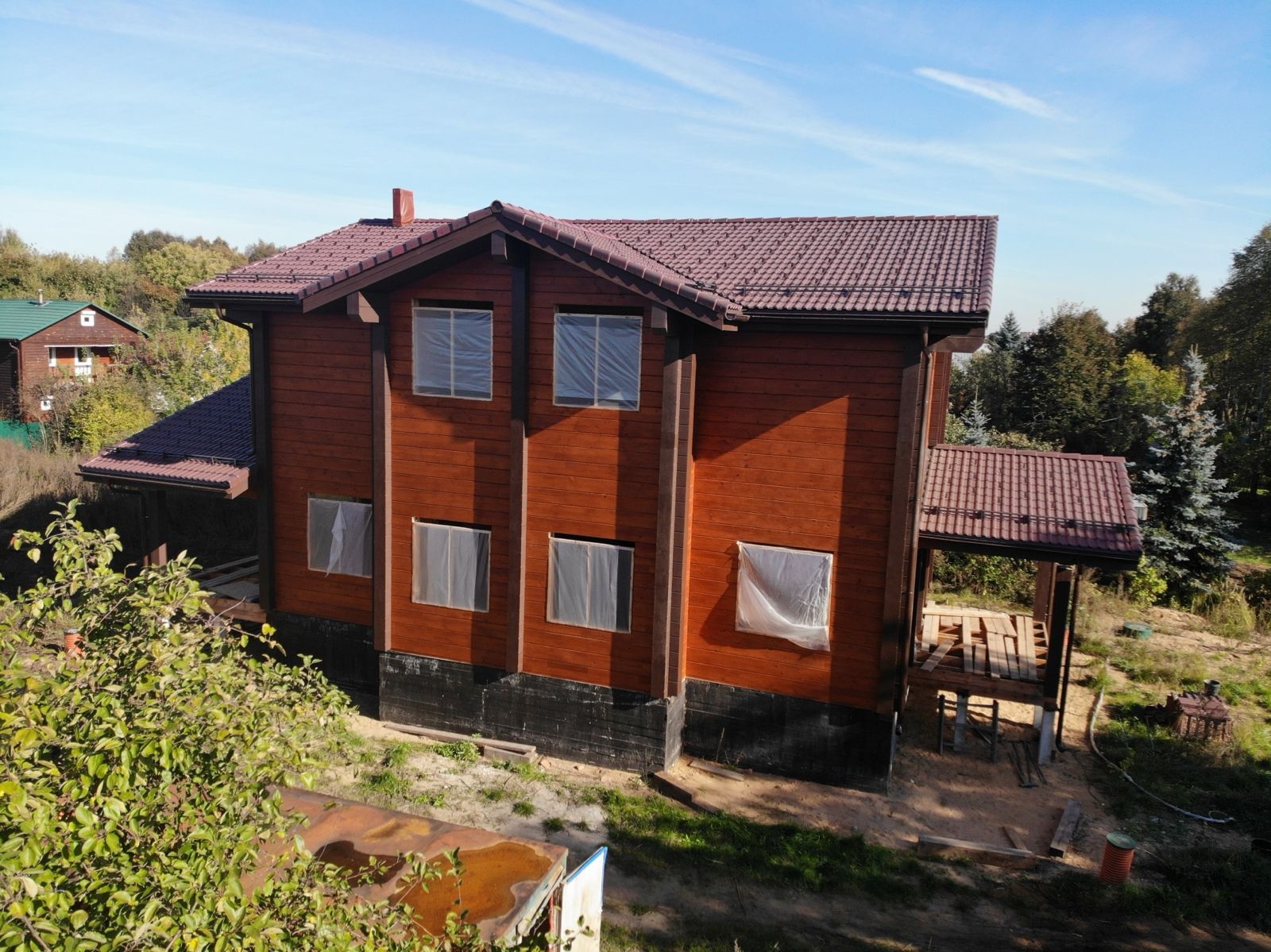 Наша бригада завершила внешнее окрашивание дома и бани. Это индивидуальный проект нашего заказчика. Площадь дома составляет 256,38 квадратных метров, а площадь бани 158 квадратных метров.