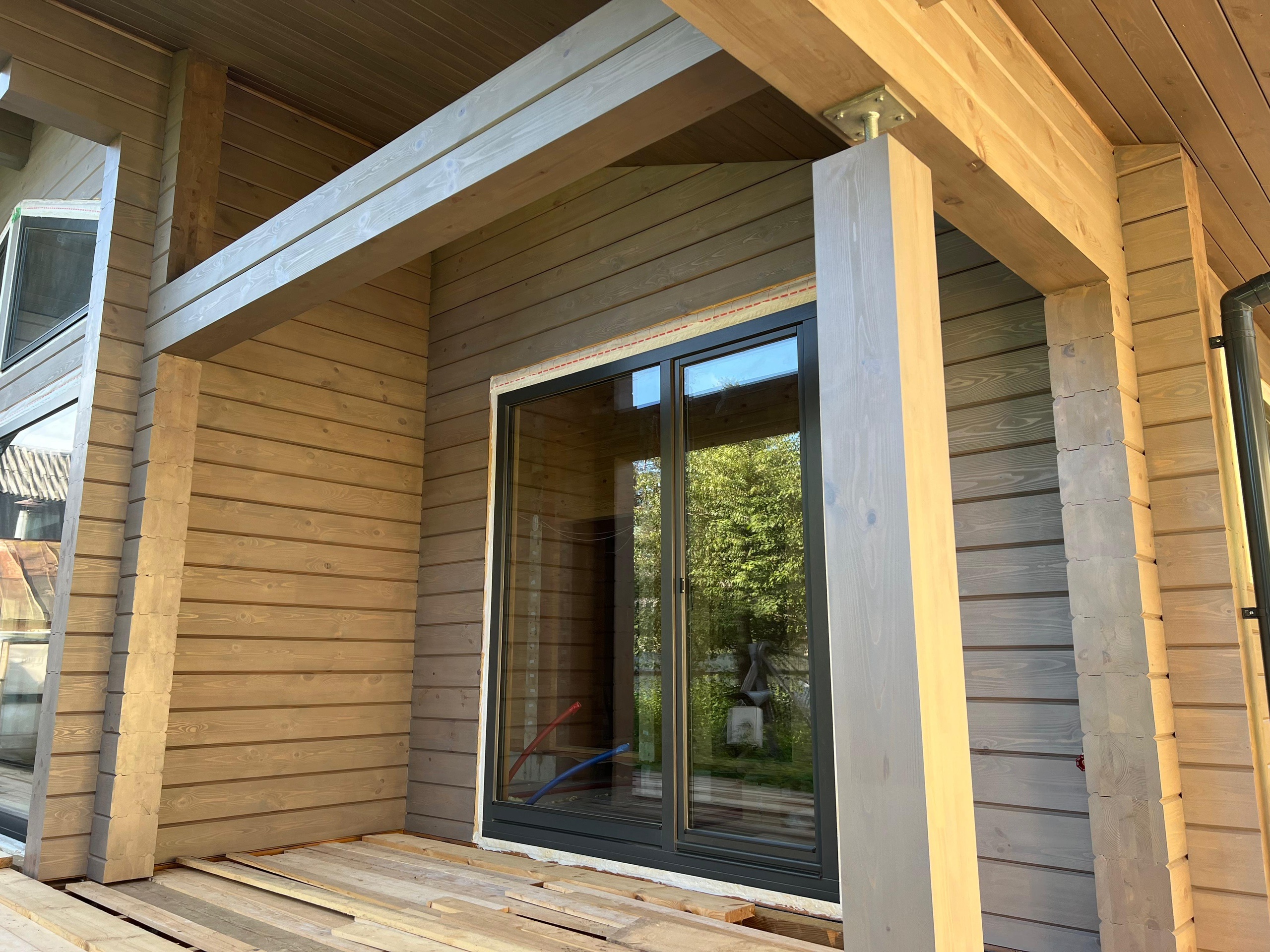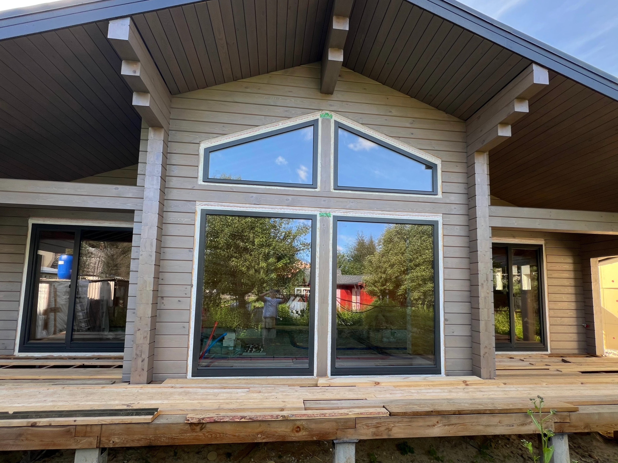 Дом построен из клееного бруса собственного производства из сосны сечением 205х185 мм. Это индивидуальный проект нашего заказчика. Общая площадь дома составляет 235 квадратных метров.