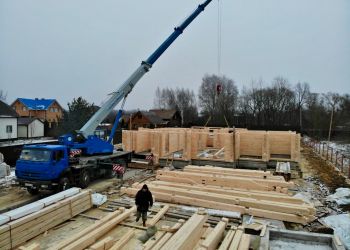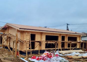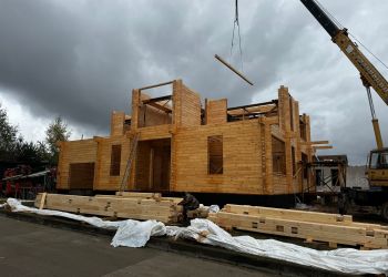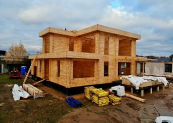 Наша бригада ведет работы по сборке сруба дома. В строительстве мы используем клееный брус собственного производства из сосны сечением 205х270(h) мм. За основу проекта был взят наш типовой проект Турин, но заказчик внес свои индивидуальные изменения. Общая площадь дома составляет 424,61 м2.