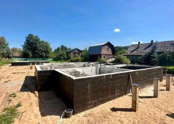 Наша бригада завершила заливку фундамента дома и бани. Площадь дома составляет 256,38 м2 и бани 164,3 м2. Оба строения являются полностью индивидуальными проектами нашего заказчика.