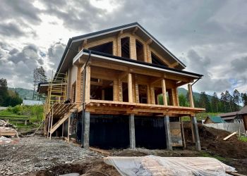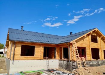 Наша бригада закончила монтаж финишного покрытия кровли, а также водосточной системы. Здесь наш заказчик выбрал мягкую кровлю. В строительстве мы использовали клееный брус собственного производства из сосны и кедра с сечением 205х185 мм. Это индивидуальный проект нашего заказчика. Общая площадь дома составляет 111 квадратных метров.