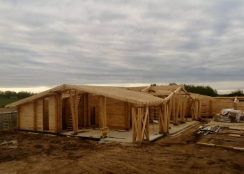 Мы продолжаем строительство дачного комплекса. Наша бригада выполняет работы по монтажу стропильной системы. Дом строится из клееного бруса собственного производства из кедра сечением 245х270 мм. Это индивидуальный проект нашего заказчика. Общая площадь дома составляет 256,38 квадратных метров.