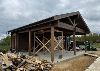 Наша бригада завершила окрашивание технического помещения с навесом в Московской области. Сейчас мы приступили к подготовке и внутреннему окрашиванию дома. В строительстве мы использовали клееный брус собственного производства из сосны сечением 205х270 мм. Площадь технического помещения с навесом составляет 71,9 м2.