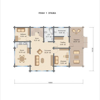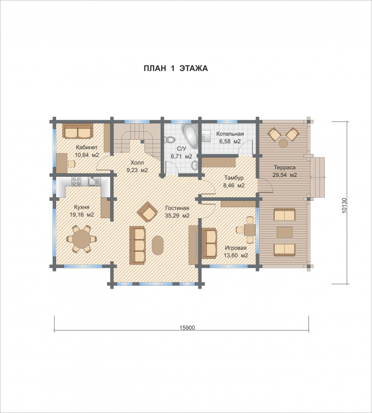 В доме есть большая гостиная, совмещенная с кухней-столовой. На первом этаже есть кабинет и игровая.