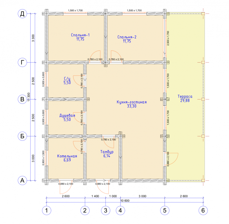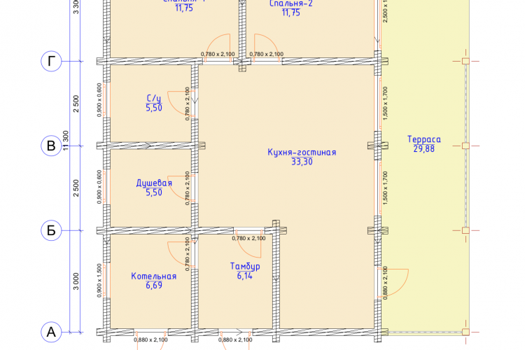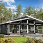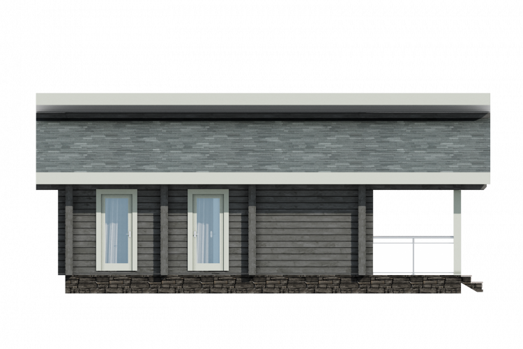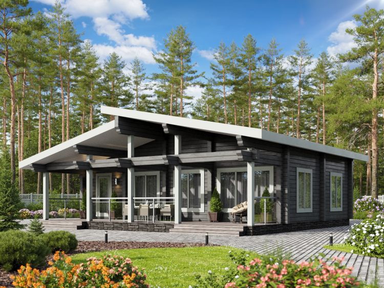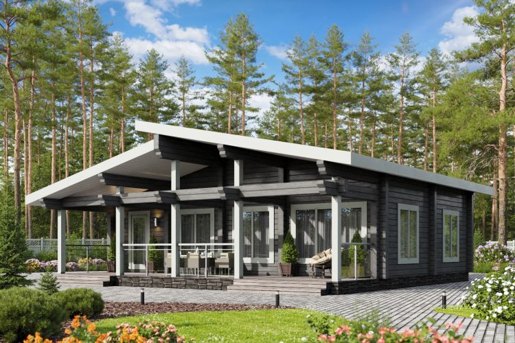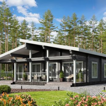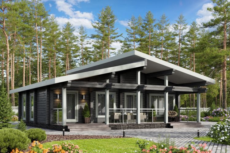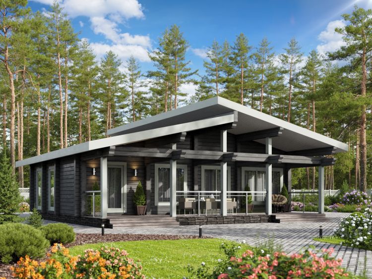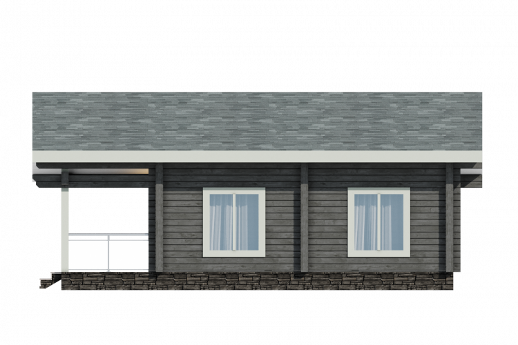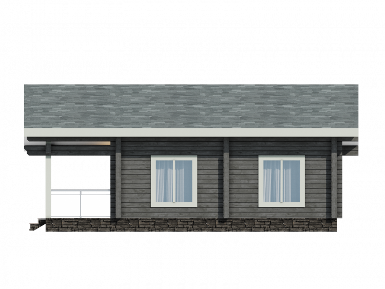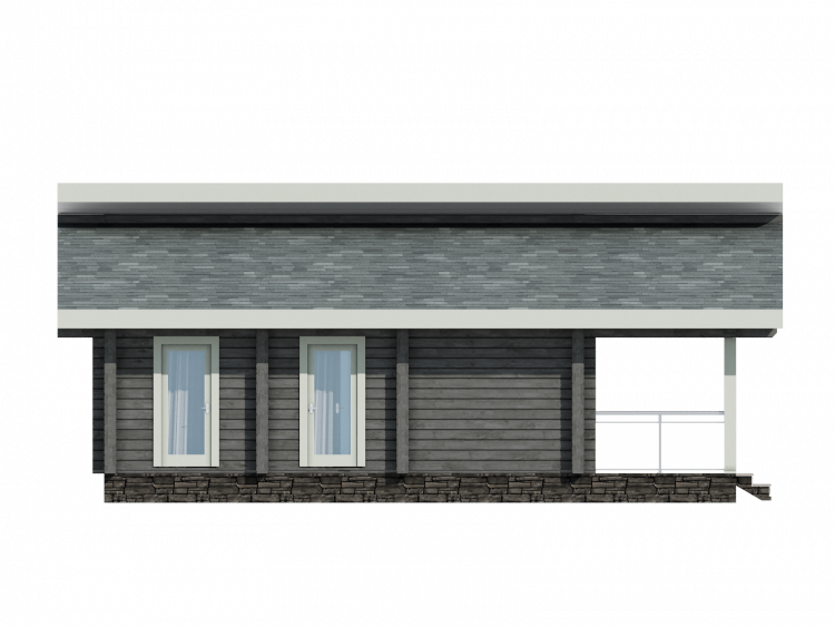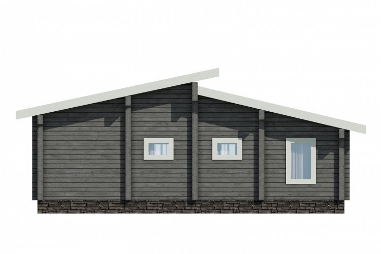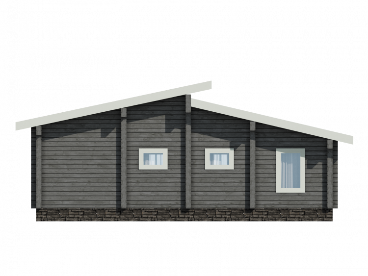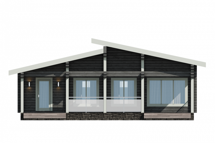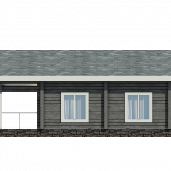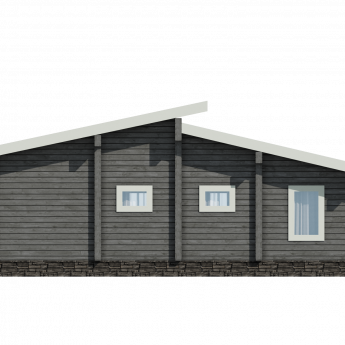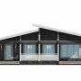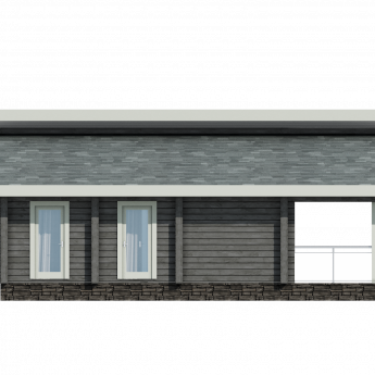 Полезная площадь проекта "Берген" - 110,5 м2. Проект предполагает наличие кухни-гостиной, 2 спален, с/у, душевой, тамбура и котельной . Одноэтажное здание оснащено террасой площадью 29,88 м2. Дом, построенный по проекту "Берген", прекрасно впишется в природный ландшафт. Разноуровневая двускатная крыша добавляет внешнему виду деревянного дома оригинальности