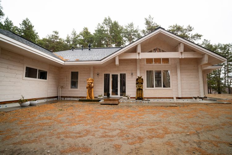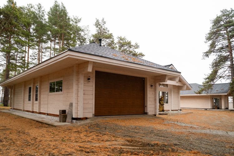 • стеновой комплект: брус клееный 185(h)х205 мм (сосна) с конструкционным запилом чашек под архитектурно-планировочное решение Заказчика