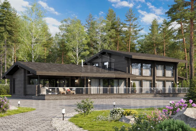 • стеновой комплект: брус клееный 185(h)х205 мм (сосна) с конструкционным запилом чашек под архитектурно-планировочное решение Заказчика