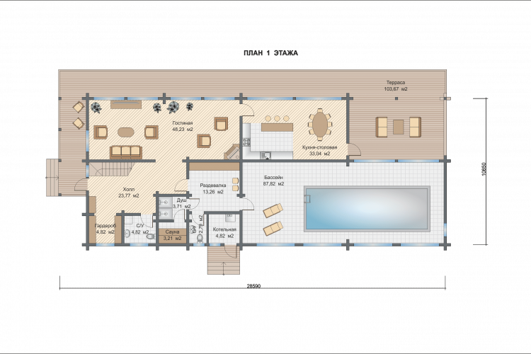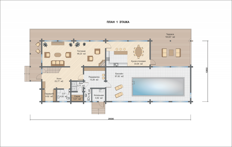 В доме есть большая гостиная. Второй свет в совокупности с большой площадью остекления создает уютную атмосферу. Изюминкой проекта «Флорида» является наличие бассейна, площадь зоны бассейна – 87,82 кв.м. Рядом с бассейном есть все необходимые помещения для комфортного пребывания.