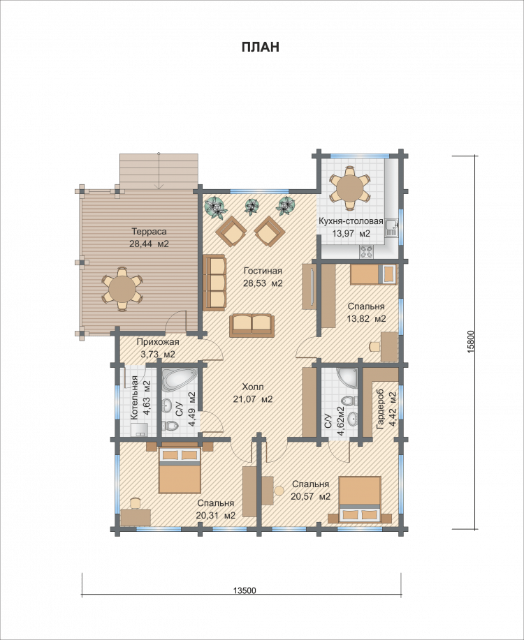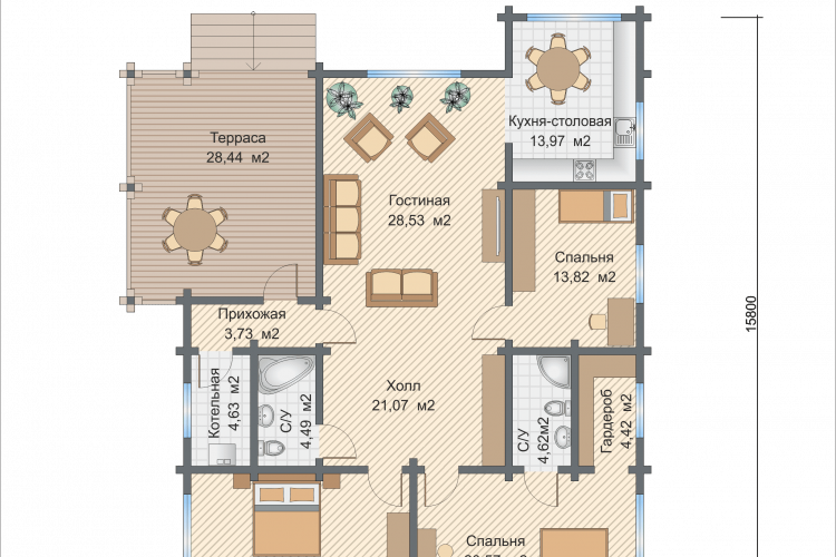 Полезная площадь проекта "Лион" - 169 кв.м. По проекту "Лион" - одноэтажное здание, которое также оснащено террасой. Площадь террасы – 28,44 кв.м.