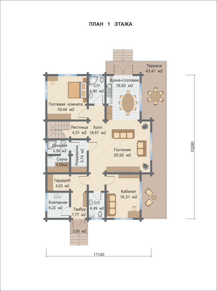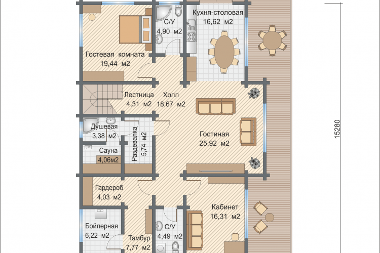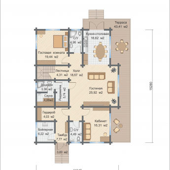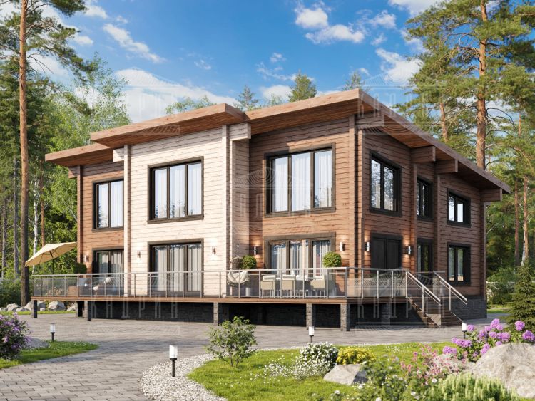 Полезная площадь проекта "Монреаль" - 300 кв.м. По проекту "Монреаль" - двухэтажное здание, которое также оснащено большой террасой, выход на которую осуществляется через просторную столовую. Площадь террасы составляет - 43,41 кв.м.