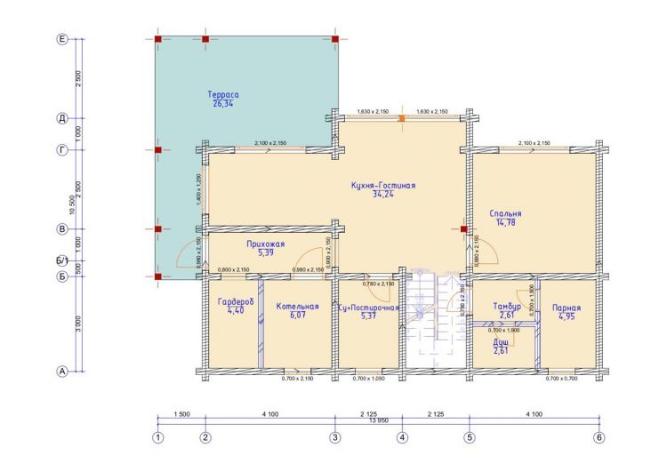 • стеновой комплект: брус клееный 185(h)х205 мм (сосна) с конструкционным запилом чашек под архитектурно-планировочное решение Заказчика