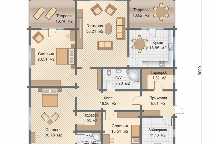 Полезная площадь проекта "Штутгарт" - 224 кв.м. По проекту "Штутгарт" - одноэтажное здание, которое оснащено большой террасой. Площадь террас составляет - 27,36 кв.м.