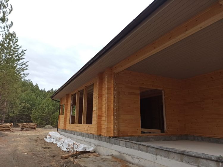 • стеновой комплект: брус клееный 185(h)х205 мм (сосна) с конструкционным запилом чашек под архитектурно-планировочное решение Заказчика