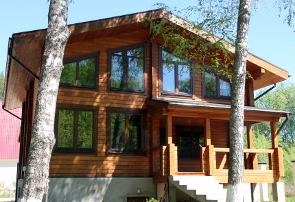 • Эстетичность. Дерево выглядит благородно и привлекательно. Специфика материала позволяет возводить строения в разных стилях, предусматривать панорамное остекление. В зависимости от личных предпочтений можно выбрать проект дома из клееного бруса в современном, минималистичном, скандинавском или другом архитектурном направлении. Чтобы придать дому индивидуальности, можно покрасить стены в любой цвет на ваш вкус.