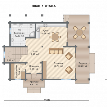 Полезная площадь проекта "Куйбышевский район" - 222 кв.м. Площадь крыльца составляет - 6,61 кв.м., площадь террасы - 33,20 кв.м., площадь балконов - 12,47 кв.м. По проекту "Куйбышевский район" - двухэтажное здание, которое также оснащено большой гостиной.