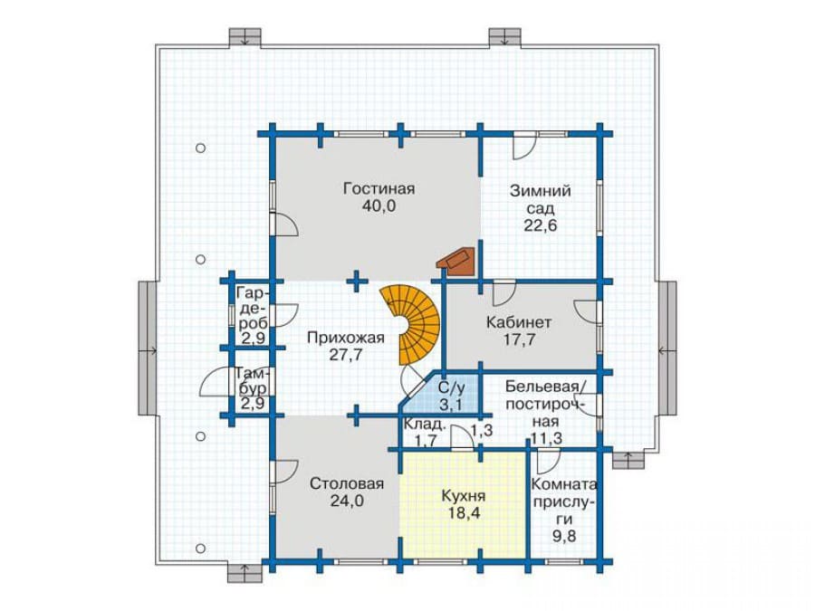• стеновой комплект: брус клееный 185(h)х205 мм (сосна) с конструкционным запилом чашек под архитектурно-планировочное решение Заказчика