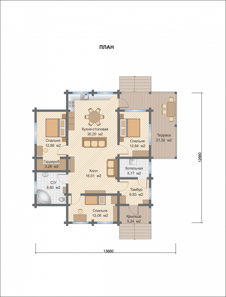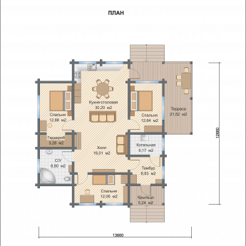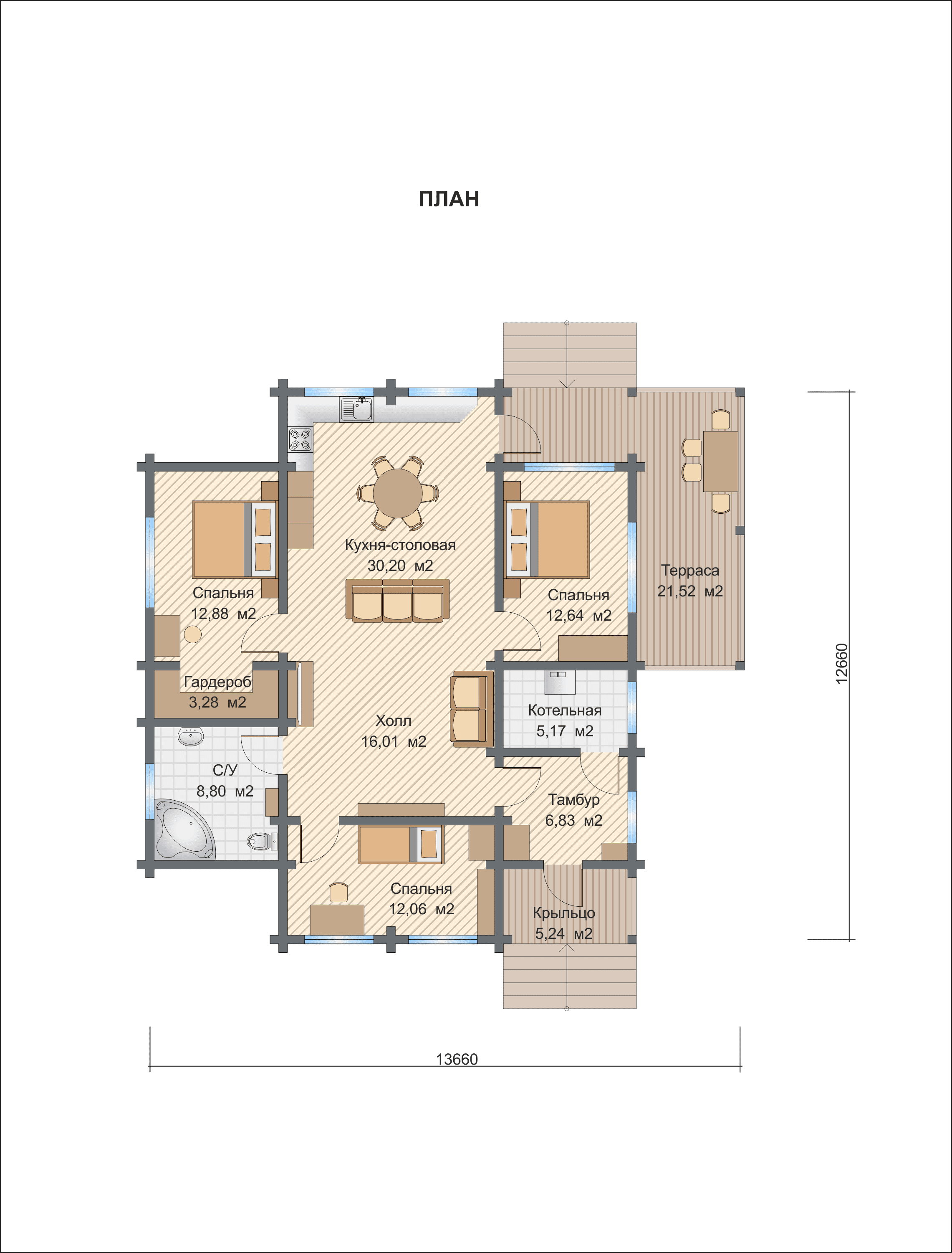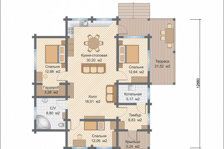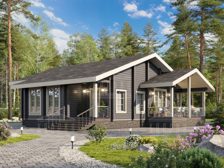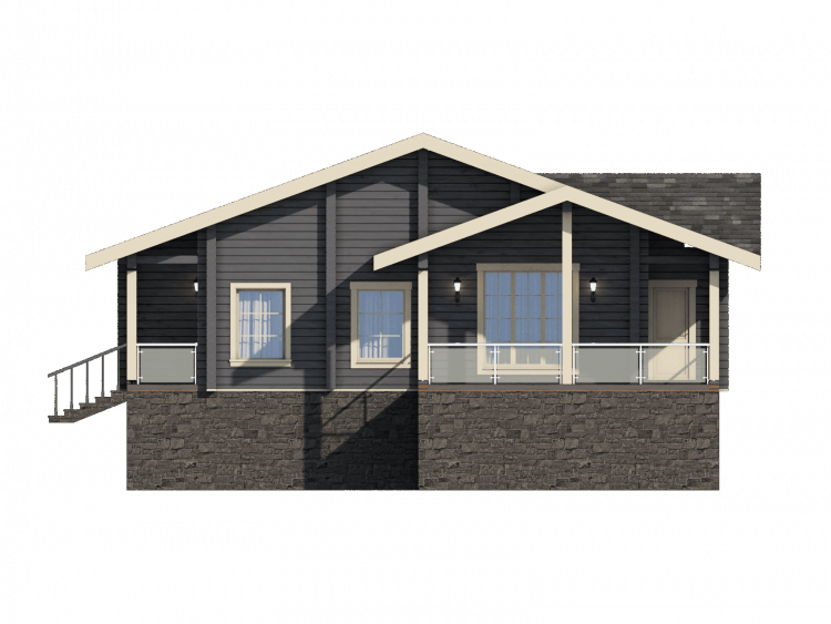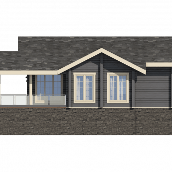 Полезная площадь проекта "Милтон" - 135 кв.м. По проекту "Милтон" - одноэтажное здание, которое также оснащено террасой и крыльцом. Площадь террасы – 21,52 кв.м., площадь крыльца – 5,24 кв.м.