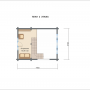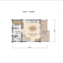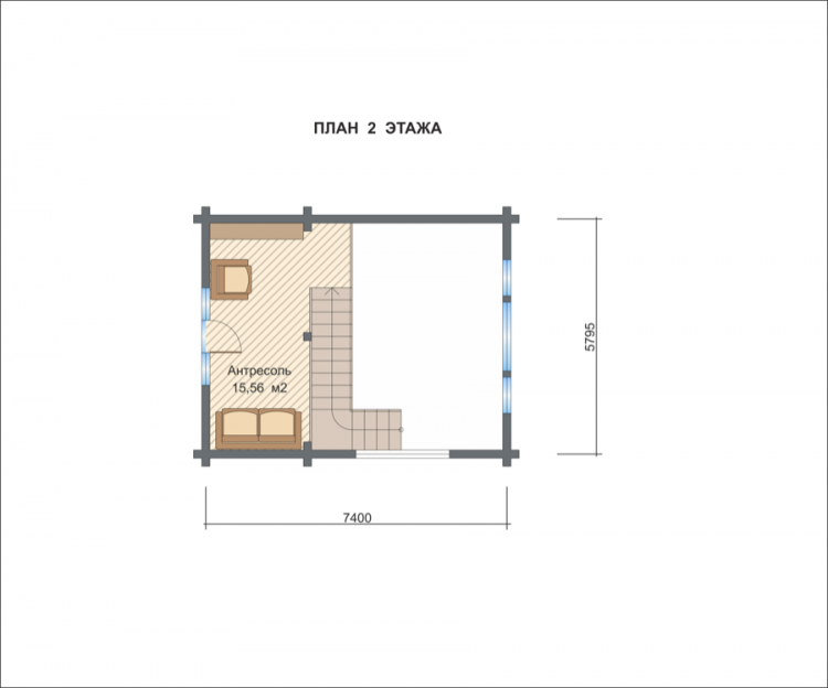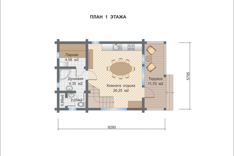 На первом этаже дома-бани расположены банный комплекс, санузел и комната отдыха с небольшой кухней. Антресольный этаж предполагается использовать как спальню.